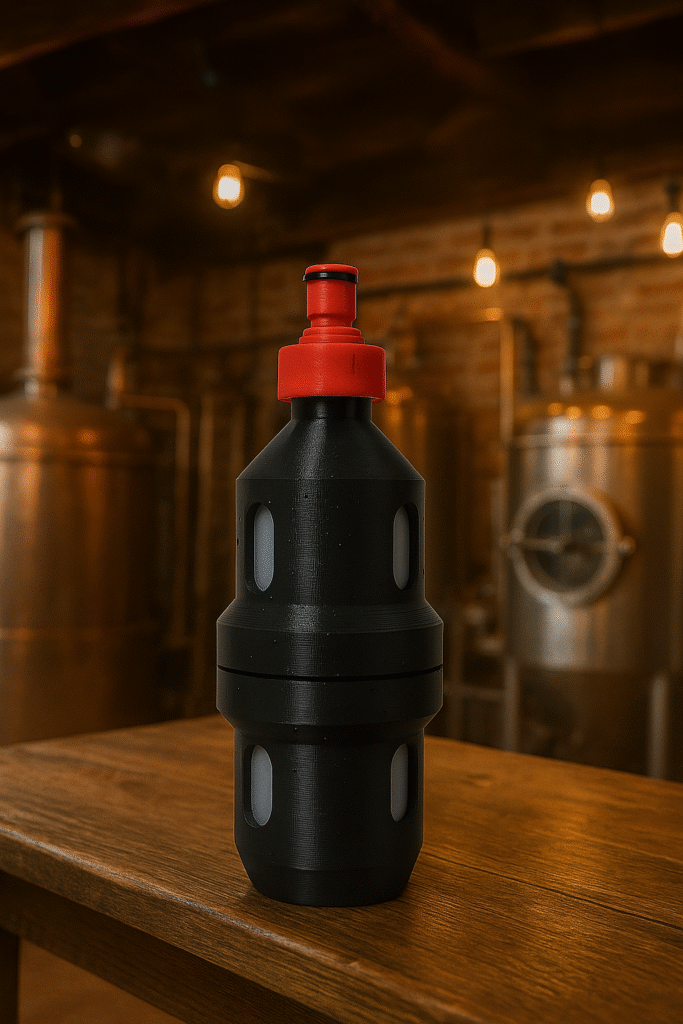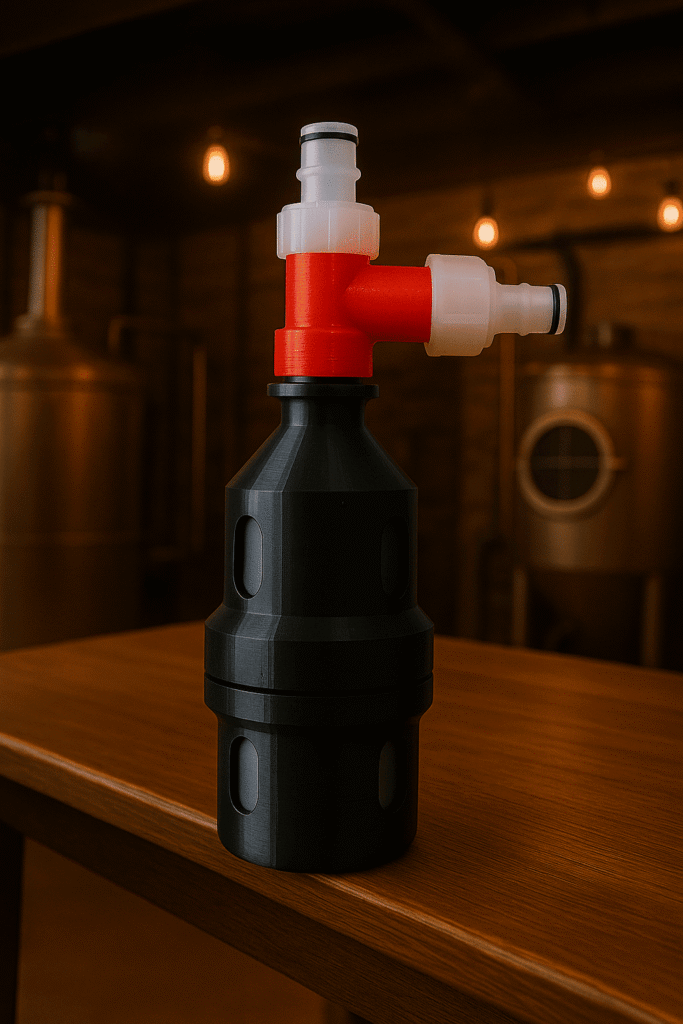 Envasador / enchedor por contrapressão para latas impresso em 3D com filamento PETG impermeável a líquidos e de fácil higienização.